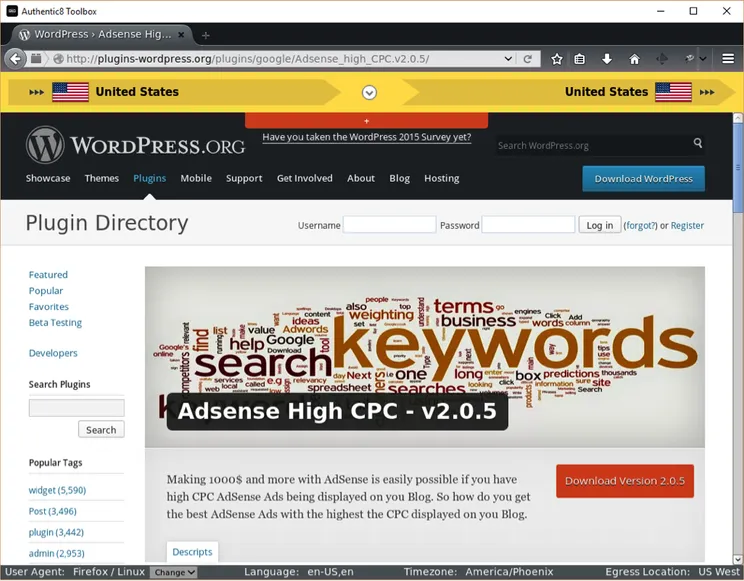 Following the link, we found a mirrored version of the WordPress.org plugins site and found that calling the naked domain, plugins-wordpress [dot] org redirected to wordpress.org. We downloaded the hosted zip file, Adsense_high_CPC.v2.0.5.zip, and verified the MD5s of the same three malicious files contained in the zip. Given the above findings, we determined the site and plugin were malicious and notified the host and domain registrar of the malicious activity and the site is under investigation.