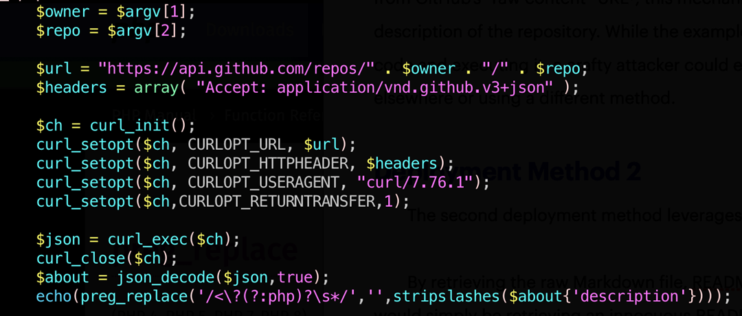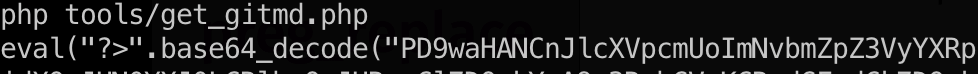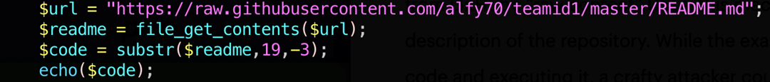 By retrieving the raw Markdown file, the README.md in the repository I found, the attacker would simply be retrieving an innocuous README. However, as shown below, some simple string replacement will convert the Markdown content into executable PHP code.