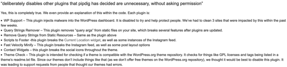 After concerns were brought to pipdig, they released an updated version of the P3 plugin, and denied accusations brought against them. In a post on their blog, which they updated on Sunday, pipdig explained their side of the situation. This was met with a large amount of ridicule on social media platforms and in blog responses from researchers. The explanations provided by pipdig did leave a lot of room for close examination. For example, their blog post lists seven plugins that are deactivated when P3 is installed and activated, however, in the plugin code, there are seventeen plugins that are disabled. They claimed that these plugins interfered with their own, but there are a number of them, including the Hello Dolly plugin, that would in no way interfere with other plugins.