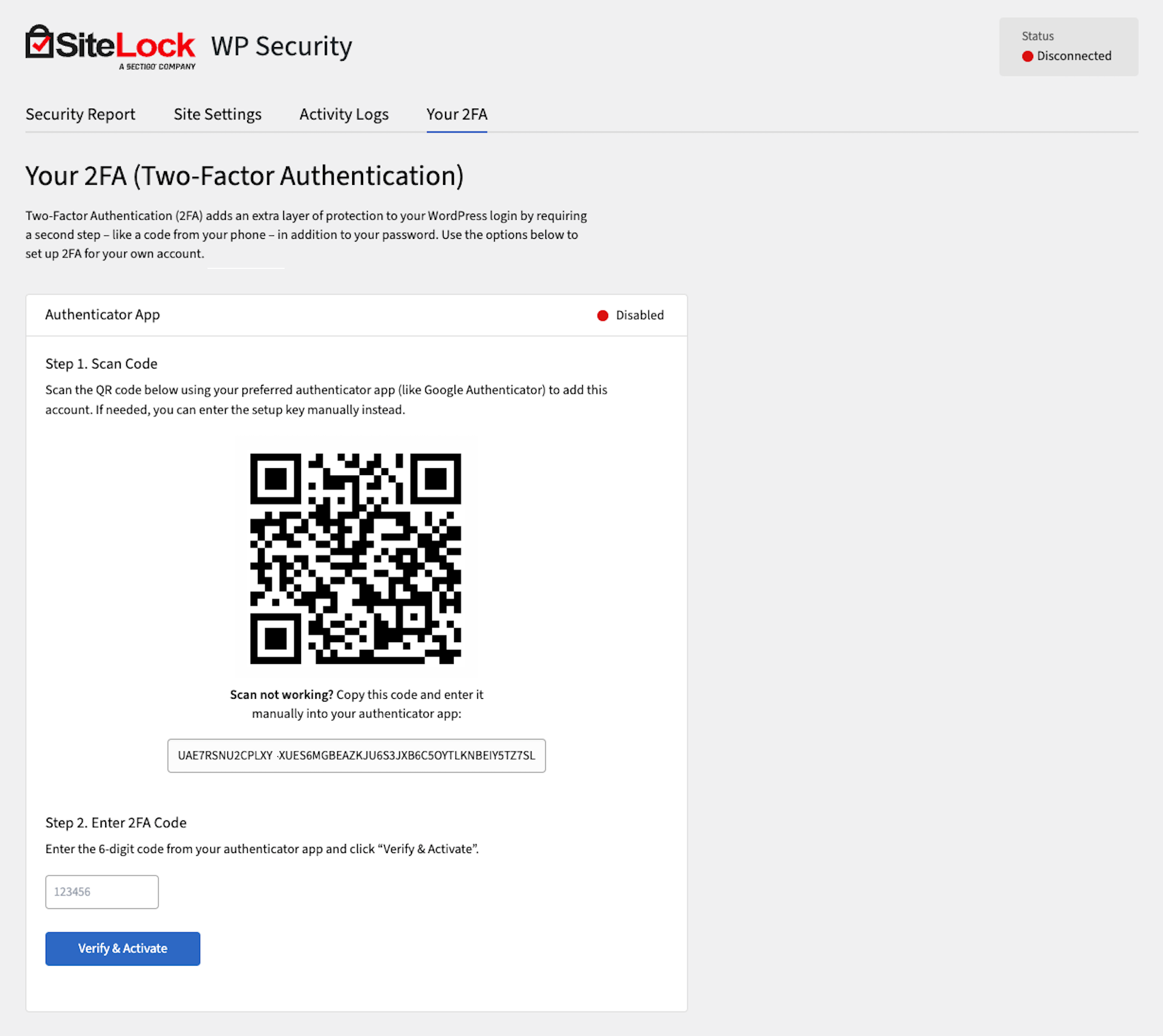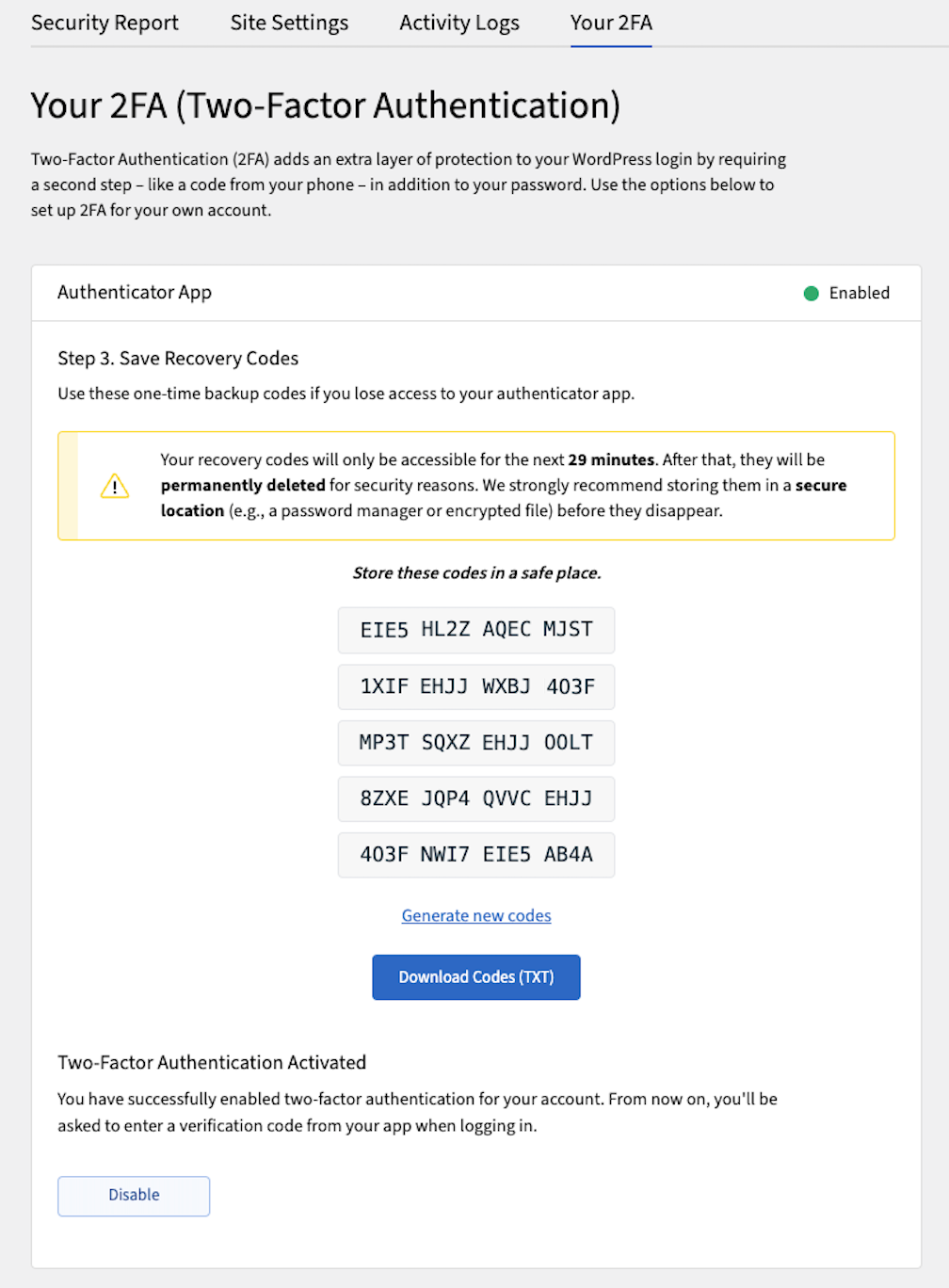 Once activated, you will be prompted to enter a 2FA code from your authenticator app each time you log in to your WordPress admin area.