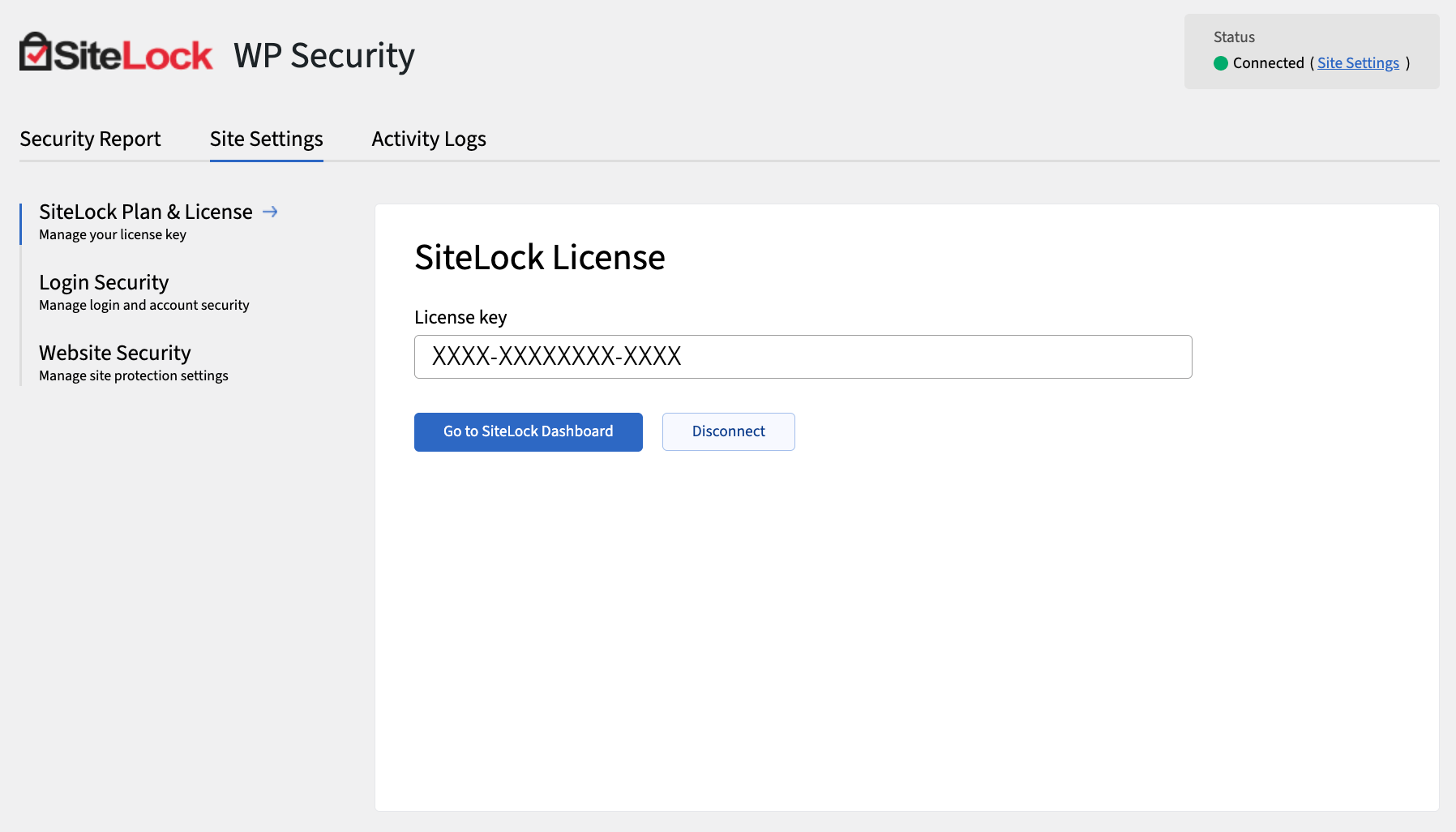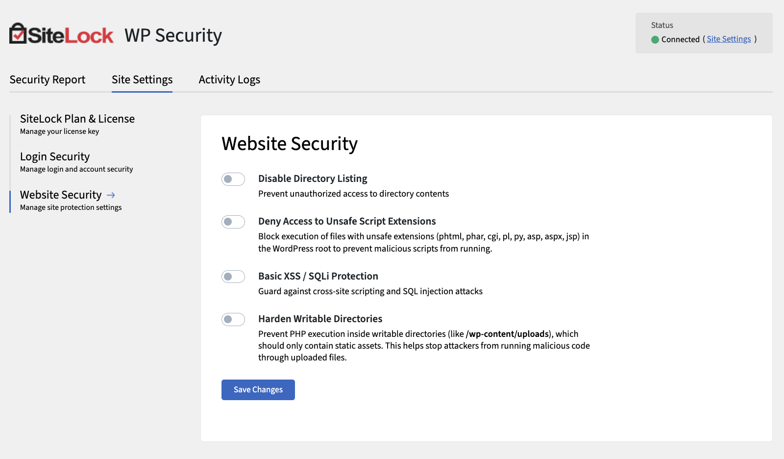 The Site Settings page allows you to configure the SiteLock WordPress plugin to suit your website’s security needs. You can manage various security features, including login protection, website hardening, and admin monitoring.
