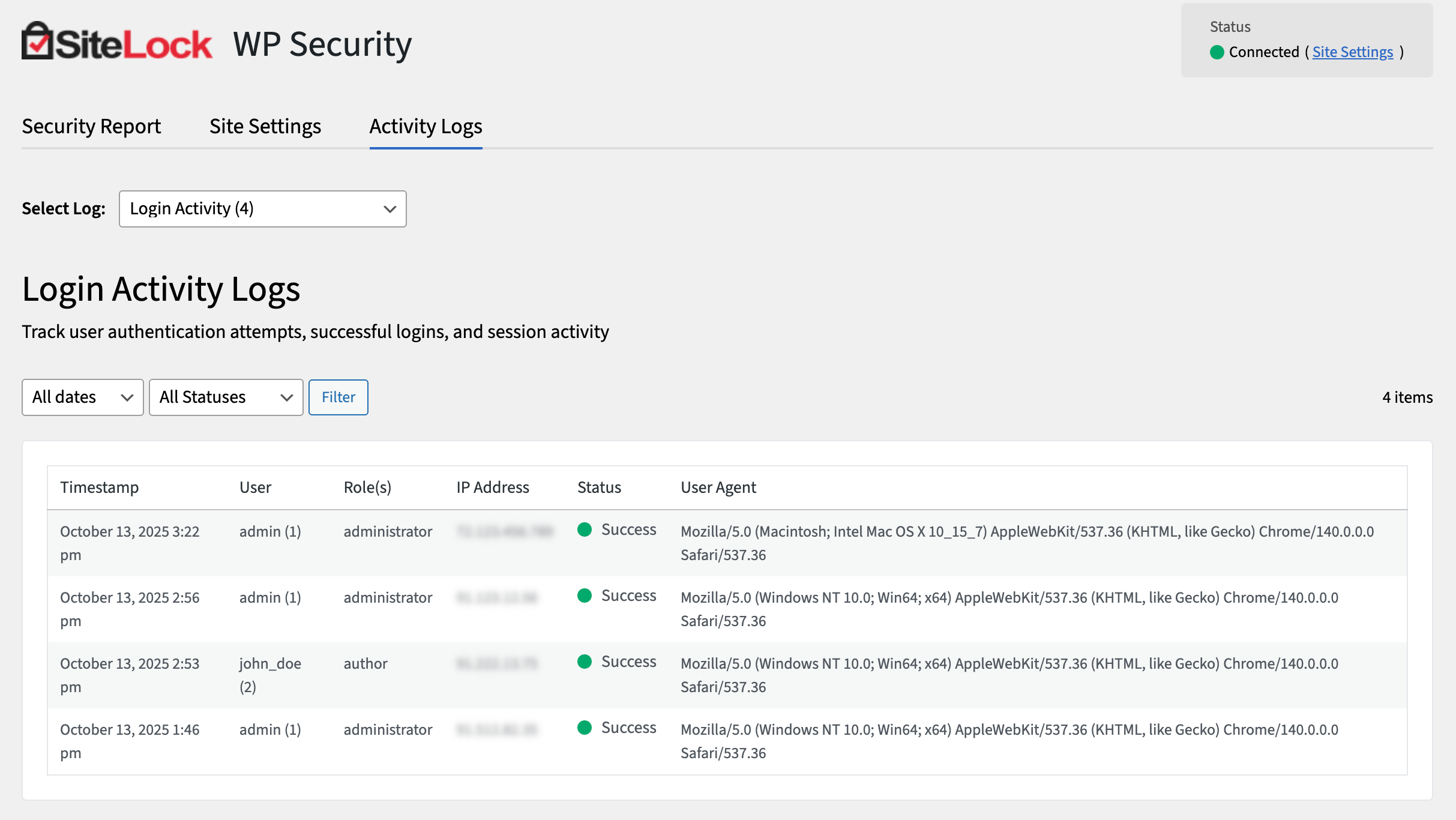 The Activity Logs page provides a detailed record of all login attempts to your WordPress admin area. This includes successful logins, failed attempts and other relevant information such as IP addresses and timestamps.