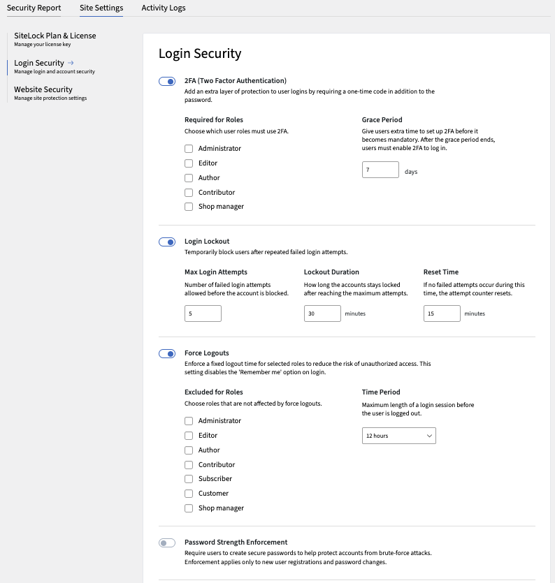 Login Security protects your website by enforcing strong authentication practices. This may include features such as two-factor authentication, password complexity requirements, and limiting login attempts.