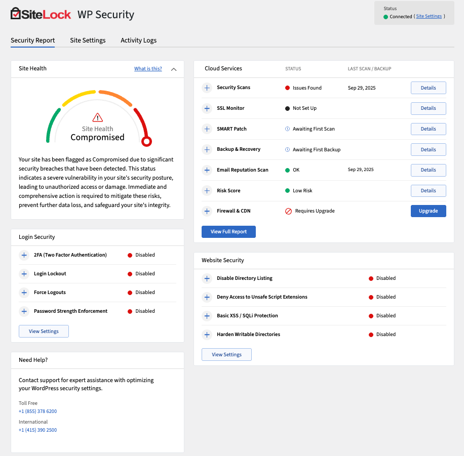 The Security Report page provides a detailed view of your website’s protection status, covering site health, login security, website security and available SiteLock cloud services.