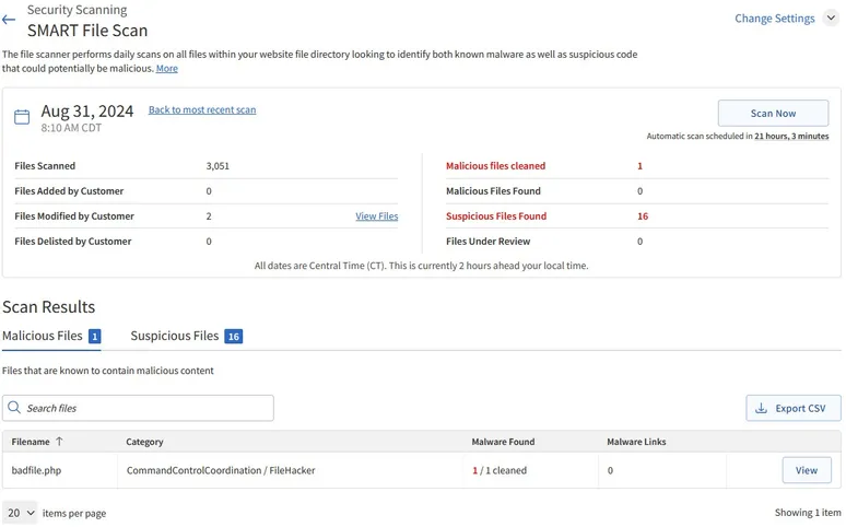 The SMART file scanner performs daily scans on all files within your website file directory and automatically removes malware.