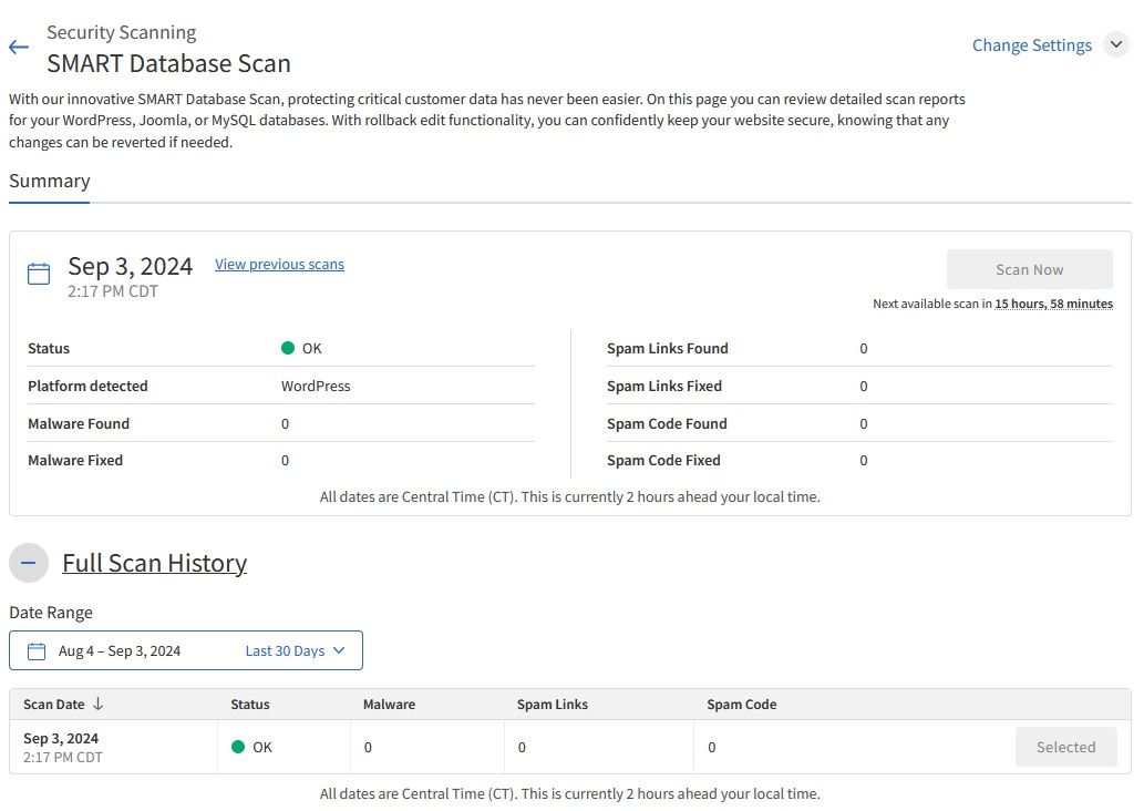 How does SMART Database Scan work?: SMART database will scan your database tables for known malware and spam content. Based on your scan preferences, SMART Database Scan will automatically remove malware and spam or simply notify you when discovered.