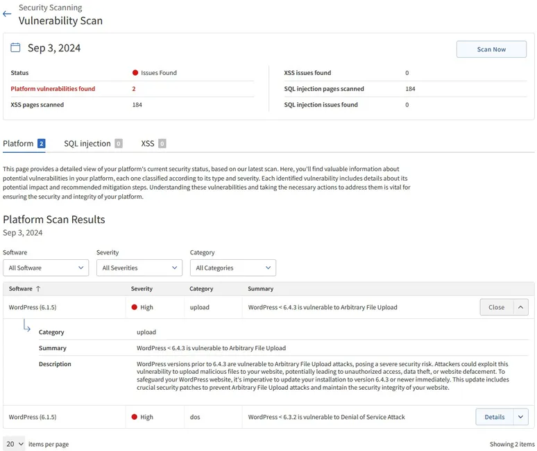The Vulnerability Scan reviews the integrity of your Content Management System (CMS), Plugins, Themes, and other Extensions for reported vulnerabilities. The scan results will compile discovered vulnerabilities based on the latest scan and provide recommended mitigation steps. If you have a CMS, most vulnerabilities are resolved by updating Core, Plugin, and Theme files to their latest versions.