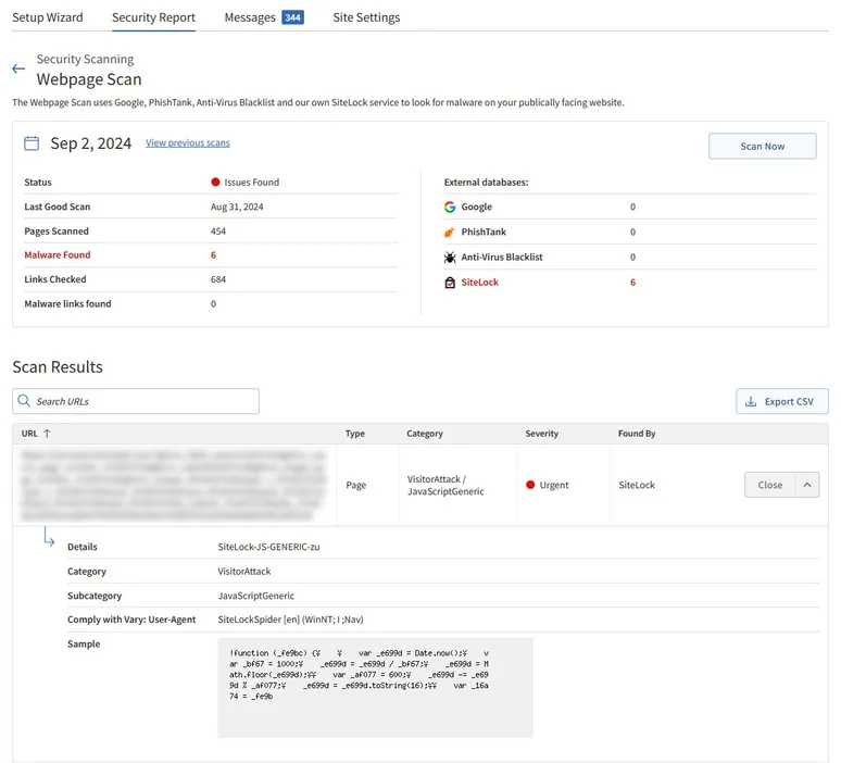 The scan results for this website will display a total number of website pages reviewed and alert you in the event that any malicious content is detected. When malware is detected, the scan results will include specific URLs that are being flagged as containing malicious code, the type of malware and severity, and even a small sample or snippet of the detected content.